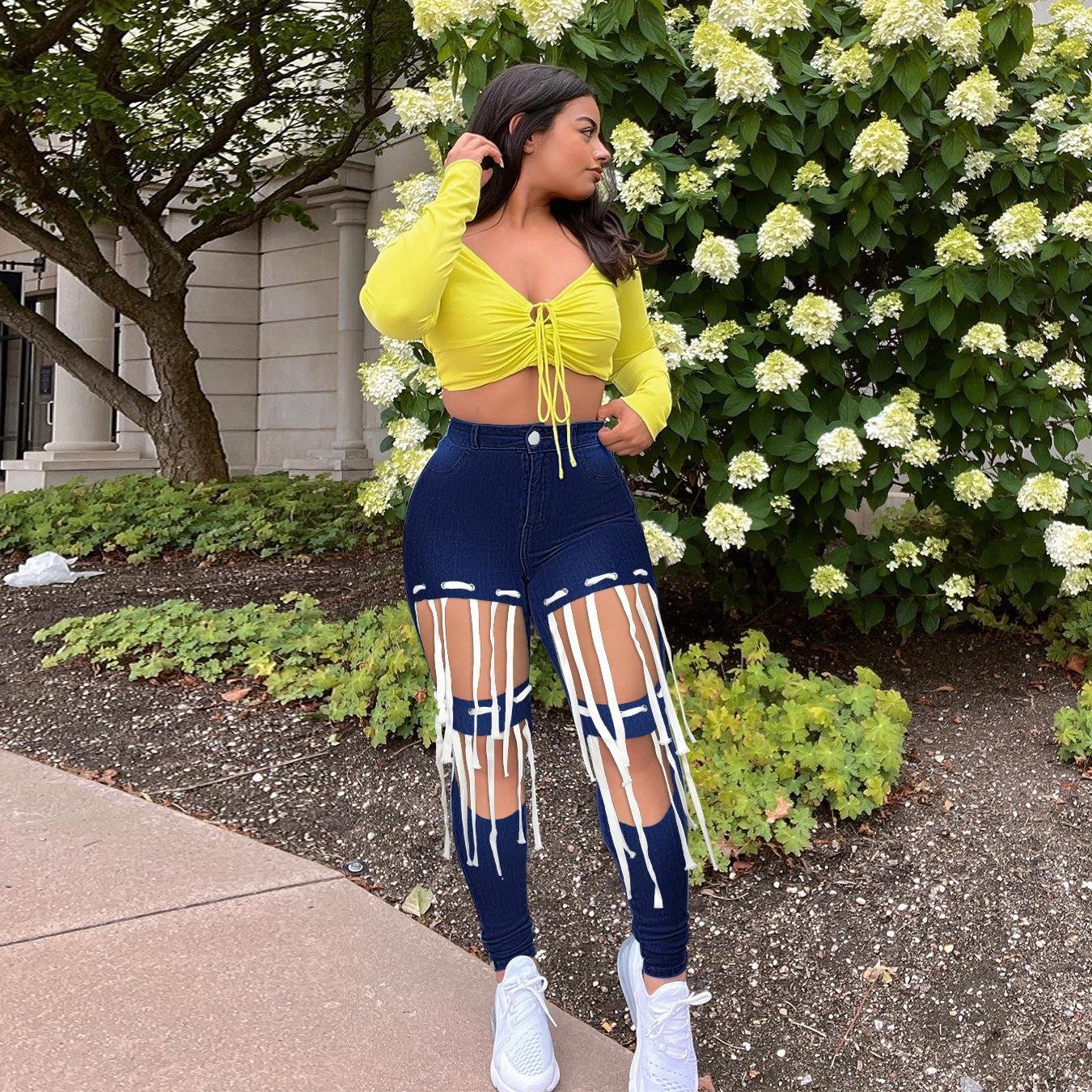 •  The distressed jeans hug your curves for a perfect fit, highlighting your silhouette and keeping you chic.
